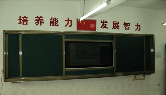 2. 外滑軌裝置:安裝兩塊移動(dòng)綠板,兩綠板尺寸之和與內(nèi)軌道白板的尺寸一致;進(jìn)行常規(guī)教學(xué)時(shí),可將此綠板滑動(dòng)到液晶電視前方,保護(hù)液晶觸摸一體機(jī),增大書(shū)寫(xiě)面積;進(jìn)行多媒體教學(xué)時(shí),將綠板拉開(kāi),使用液晶觸摸一體機(jī)。
